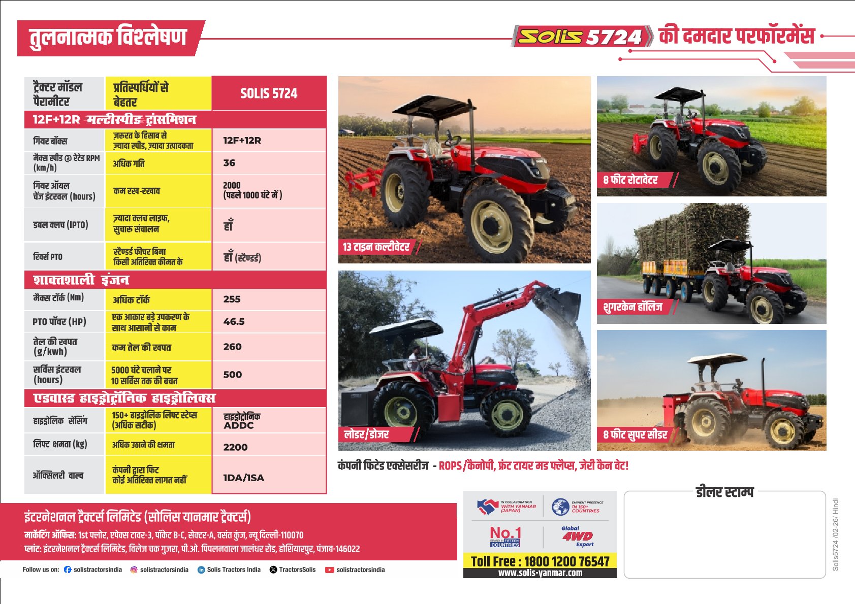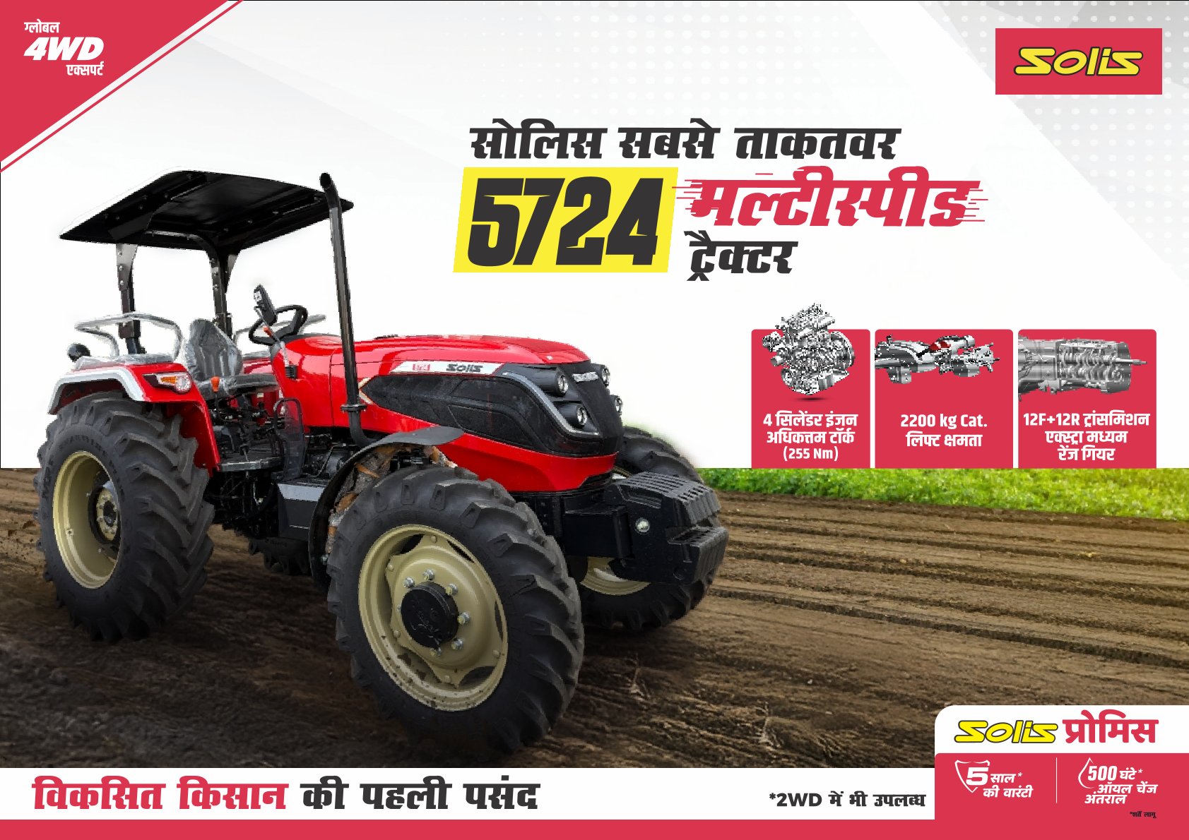 Solis 5724-2WD is a Japanese Technology powered tractor in 57 HP category developed especially for farmers’ prosperity. Equipped with best 57 HP tractor engine, the Solis 5724-2WD delivers unmatched performance for maximum productivity at 2000 rated RPM. The Solis 5724-2WD is equipped with Fully Synchromesh type 12F + 12R gear transmission for higher efficiency. Alongside large and spacious platform, it gets ergo designed seating for farmers’ better comfort. Having 7.5*16 at the front and 16.9*28 at the rear, the Solis 5724-2WD offers better vehicle control with brakes. It also gets lift capacity of 2500 Cat kg and precise hydraulics for best operational results. Designed for various applications such as Puddling, Potato Sowing, Dozer, Loader, the state-of-the-art Solis 5724-2WD is a technology marvel best suited for crops and soil specific conditions, thereby allowing them to earn more income and achieve prosperity. For more details and Solis 5724-2WD price information, please give a missed call at +91 9667133997